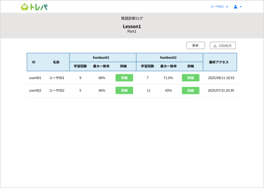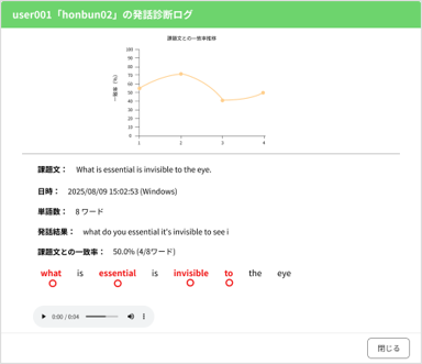 生徒の学習成果(音声や発音の一致度)を教師用管理アカウントから確認することで、成績管理も行えます。