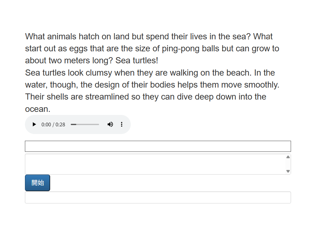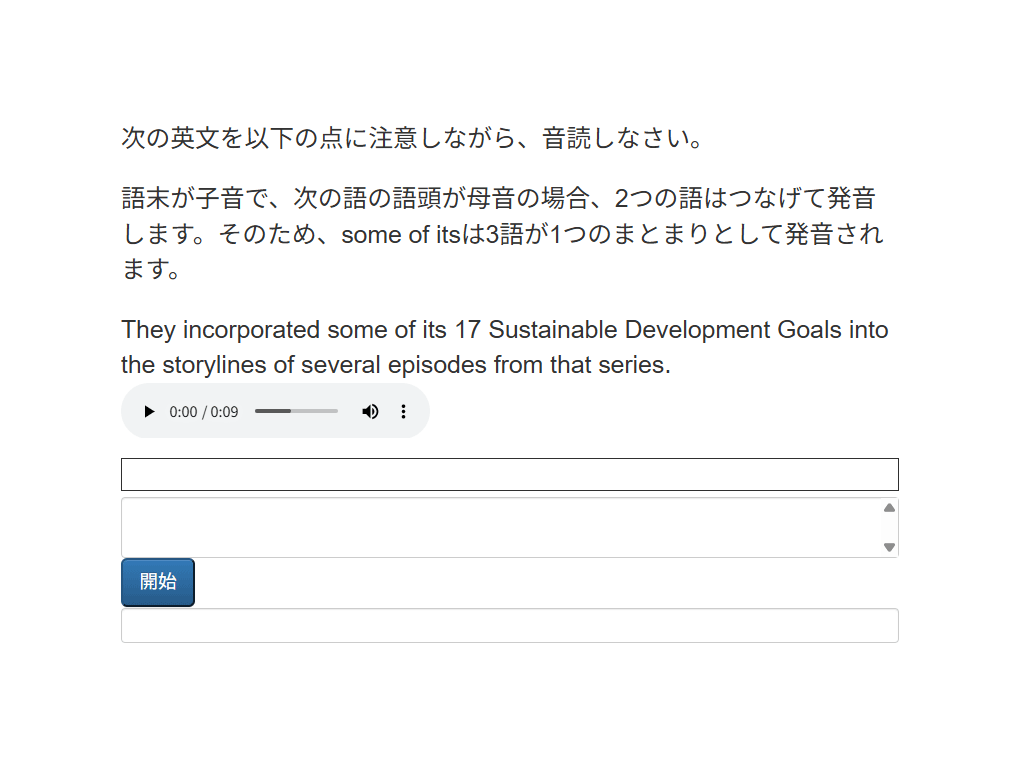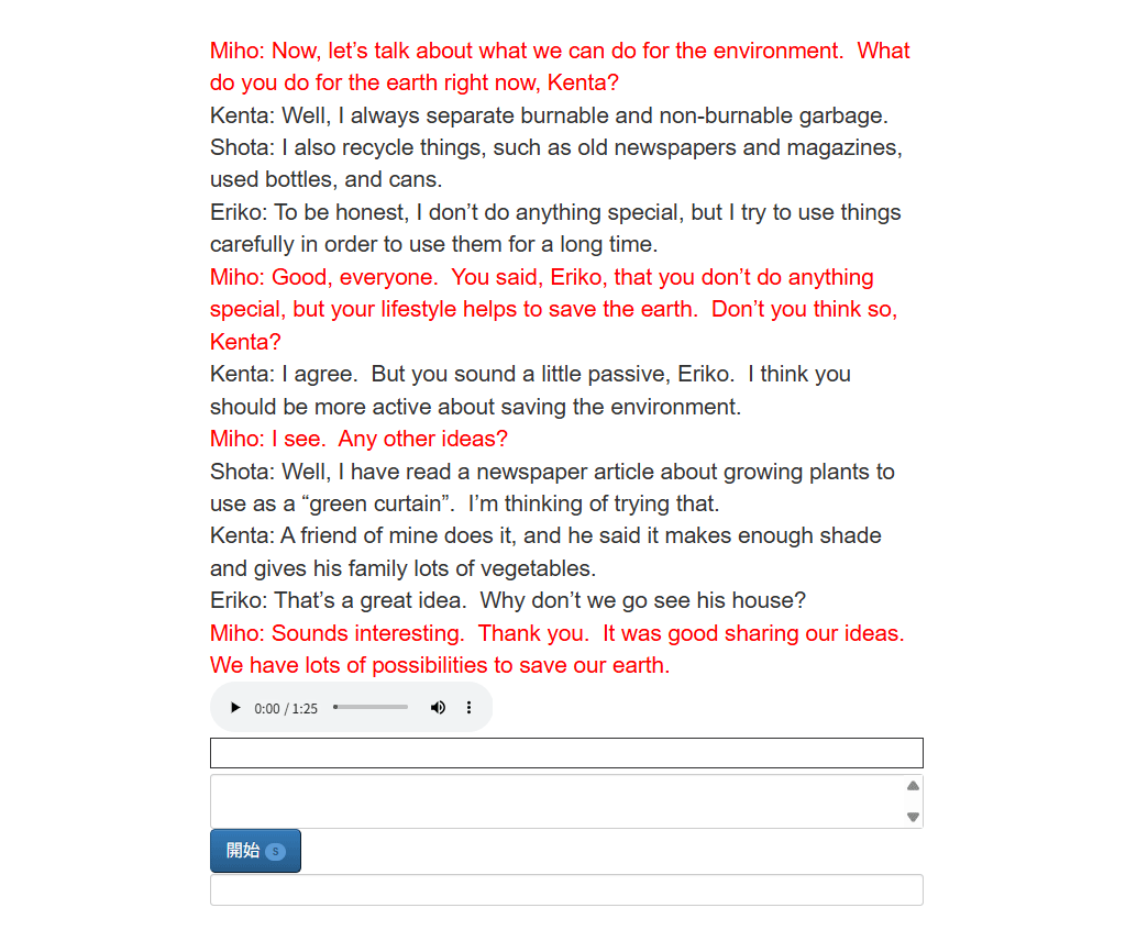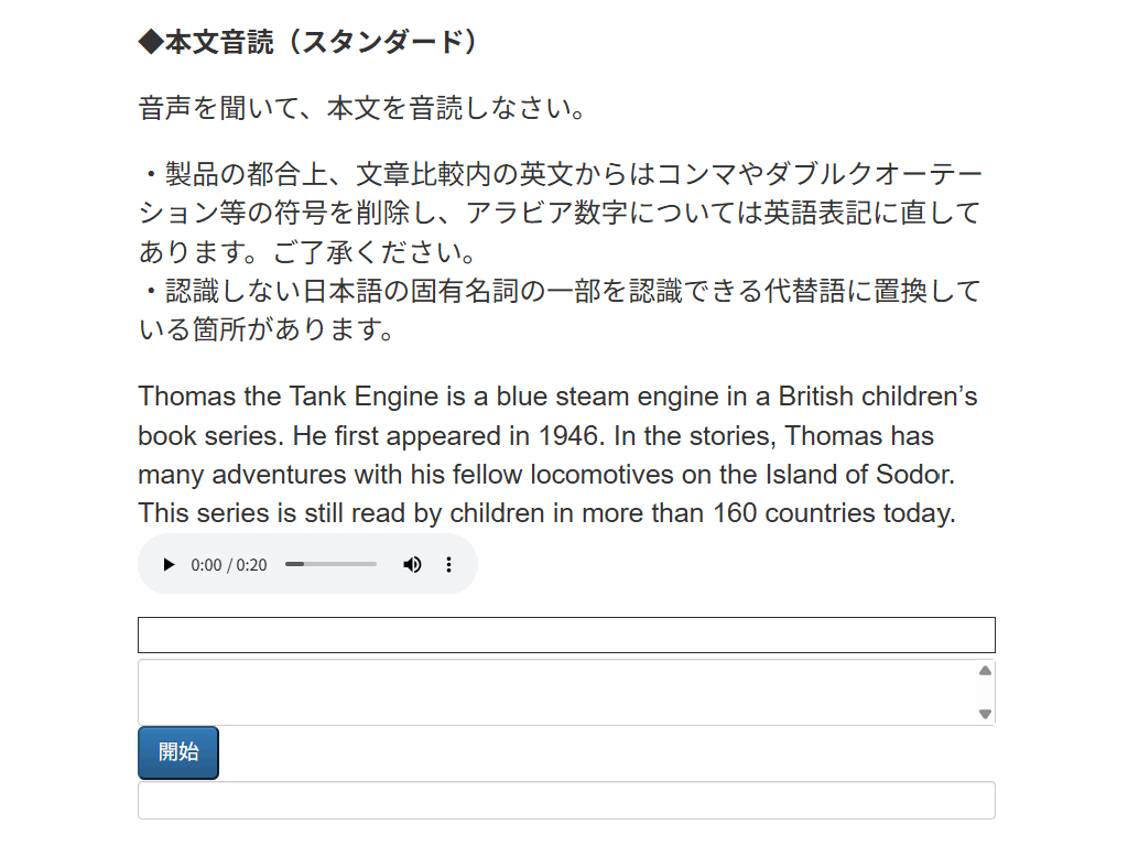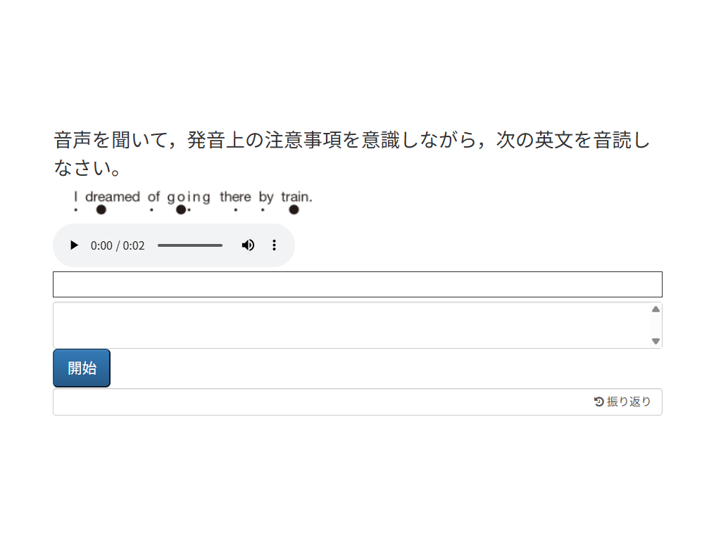 ロールプレイに疑似的に取り組める音読タスクです。音声は、表示されているテキスト上で赤色になっているパートが音のない状態なので、そこを生徒が音読します。イヤホンまたはヘッドホンが必要になりますが、赤色の部分だけをAIに認識・評価させることが可能です。