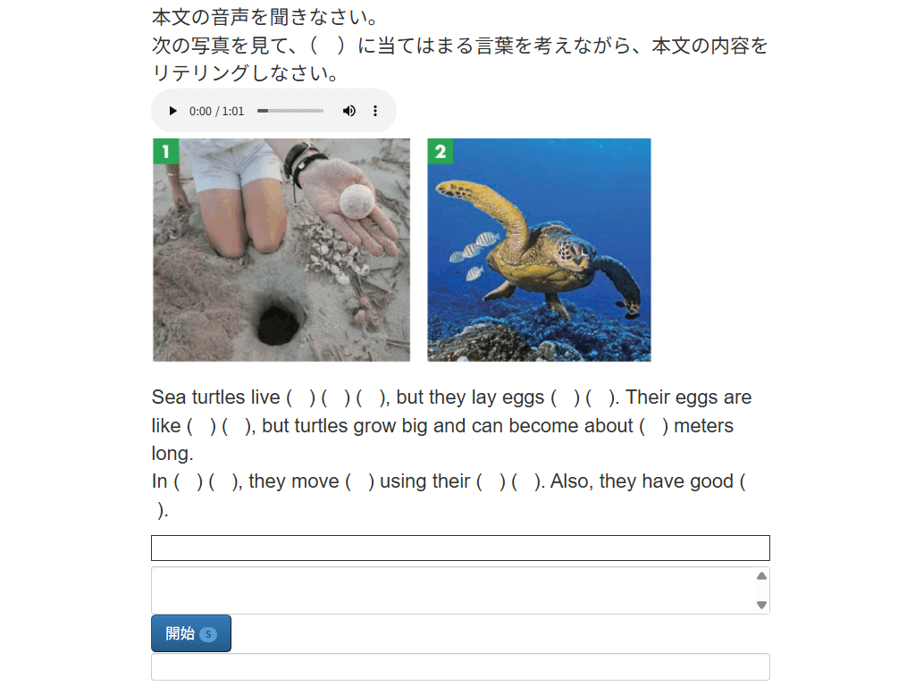 教科書の写真やイラスト等を見ながら、お手本となるリテリング文の穴埋めをして、本文の内容を頭の中で整理していきます。最初は難しいと感じる生徒でも、festa!で繰り返し練習することで、少しずつ本文の内容が頭の中で整理され、徐々に自分の言葉で伝える力がついてきます。