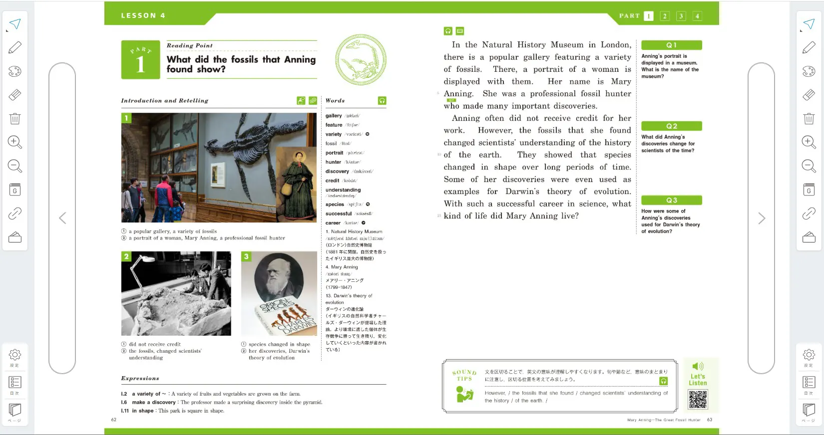 - 教科書に掲載のQRコードをお手持ちのスマートフォンなどで読み取れば,Words,本文普通読み,本文フレーズ読み,SOUND TIPS,Rapid Readingや,一部 Final Taskの音声を聞くことが可能です。※インターネット環境が必要です。