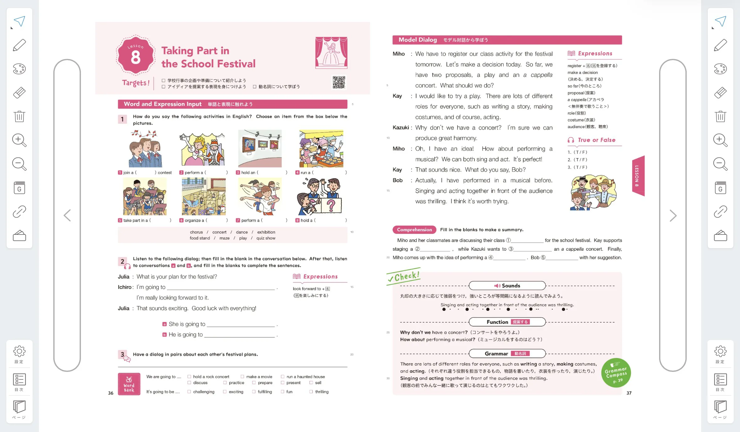 - 「活動」を支えるという観点から,自然な英文の中で使われる重要な文法事項を厳選し,各Lessonに配置しています。また,各Lessonで学習する文法事項を活用する言語活動を収録しています。