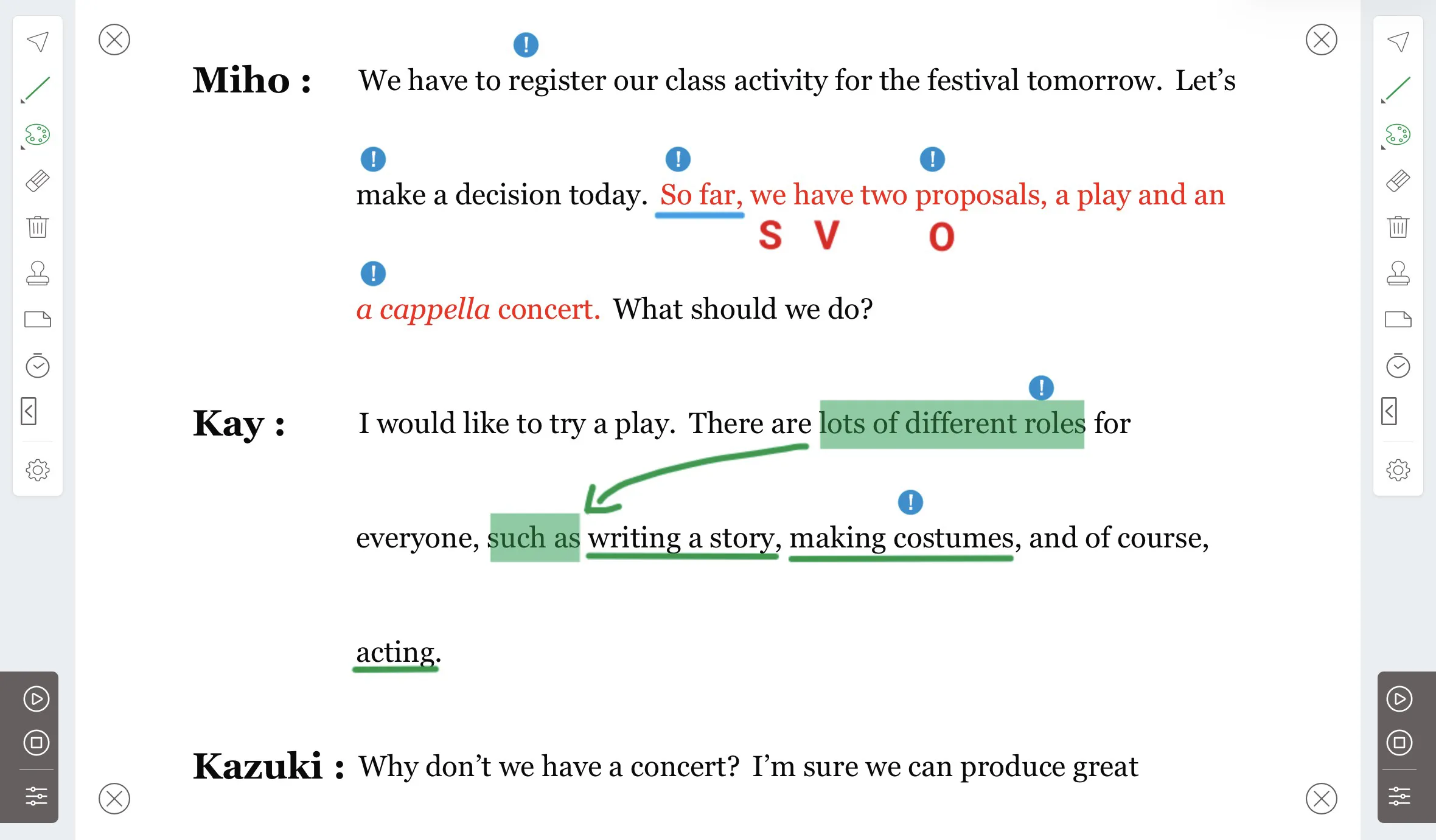 ディスカッションでは,主張や相手の意見を確認する方法,司会者の決まり文句などを確認し,少しずつ難易度の高い課題に取り組みます。ディベートでは,やさしい形式から始め,段階的にディベートのテクニックや特有の表現を学び,最後に本格的な形式にチャレンジします。